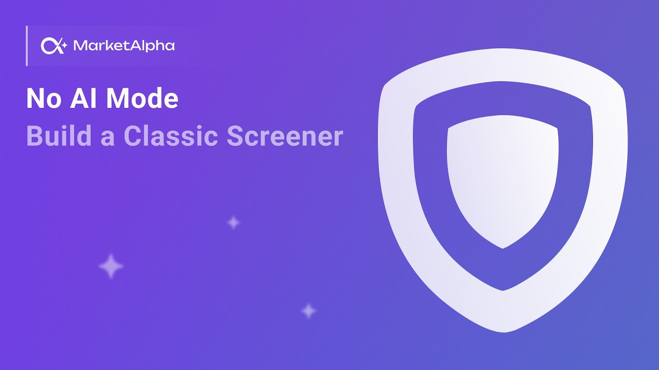 No-AI Mode gives you a clean, traditional screener and charting experience while keeping MarketAlpha’s core platform features intact. Remove AI strategy columns from your profile, hide AI overlays on charts, and save both settings so you can switch between classic and AI-driven workflows instantly.