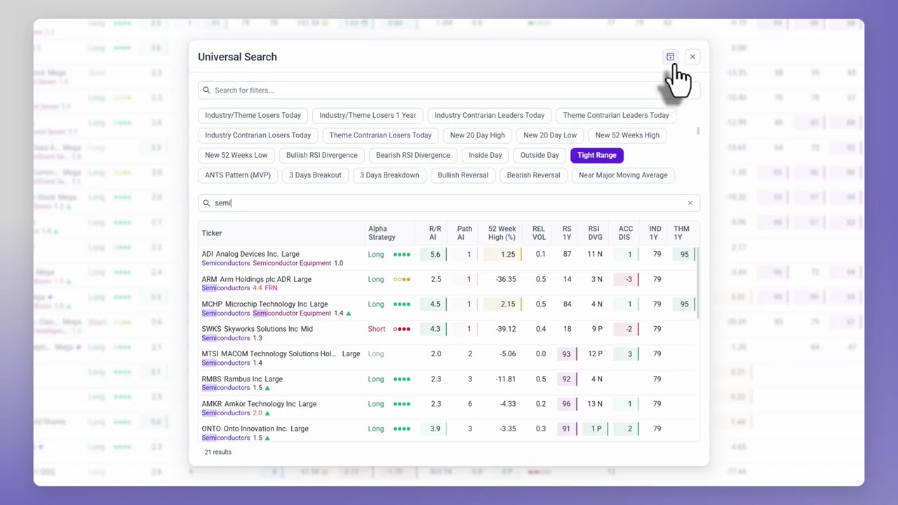 If you combine a filter (e.g. Top Alpha Setups) with a symbol or group search (e.g. Semiconductors) in Universal Search, both will be carried into the Screener view.