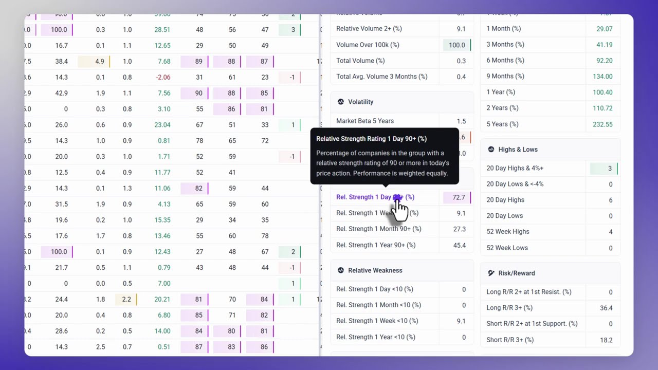 - Sort by metrics like Risk/Reward, Relative Strength, or Divergence