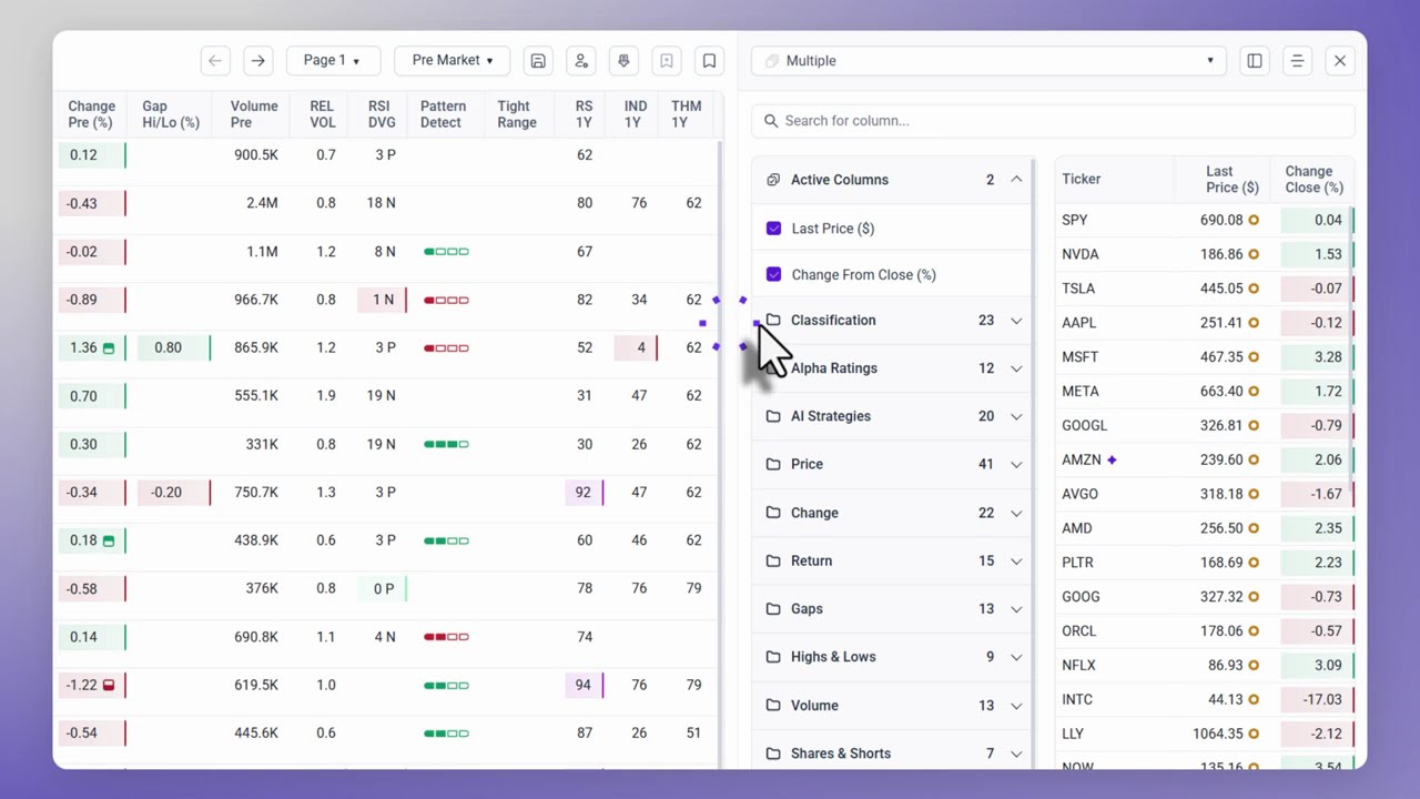 Watchlist columns give you complete control over what you see while monitoring tickers. Add your favorite metrics, reorder them for clarity, and analyze your lists the way you prefer — all from a streamlined view.